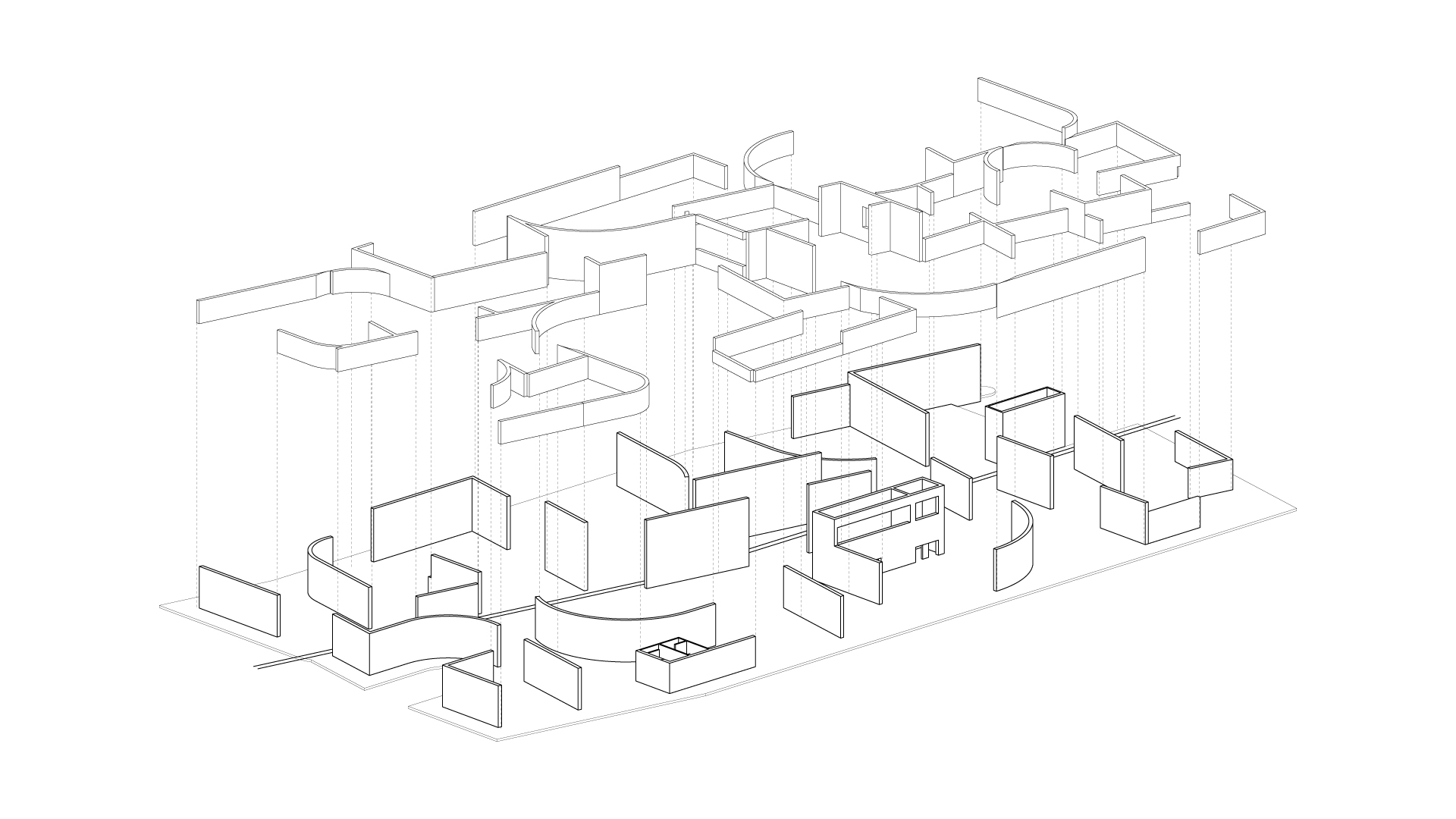Two grids, extending from the Tejo power station and the Tagus river, are distorted by rotation, misalignment, division, and introduction of curves. As the manipulations take place, every space is affected from different origins. The boundaries between the neighboring spaces are registered selectively by fragments of walls and corners, allowing for a sense of spatial continuity and disorientation throughout the museum.